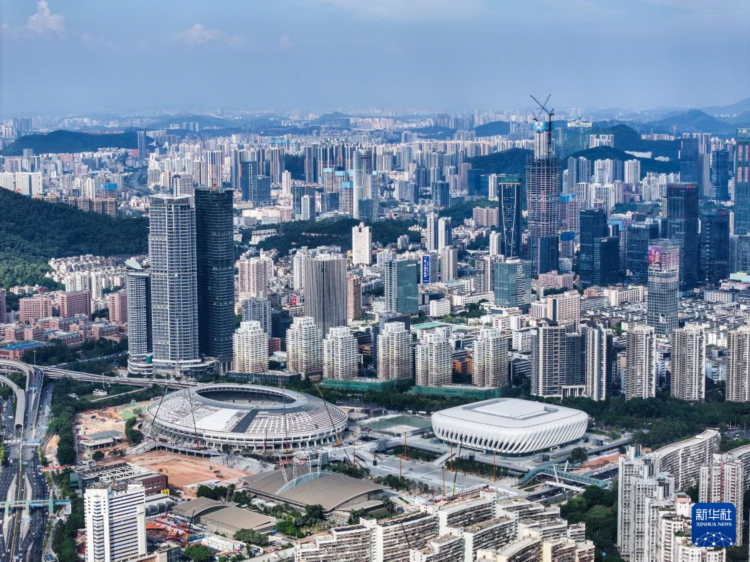 远眺深圳市体育中心的专业足球场(左)和开合屋盖体育馆(无人机照片,10月16日摄)。