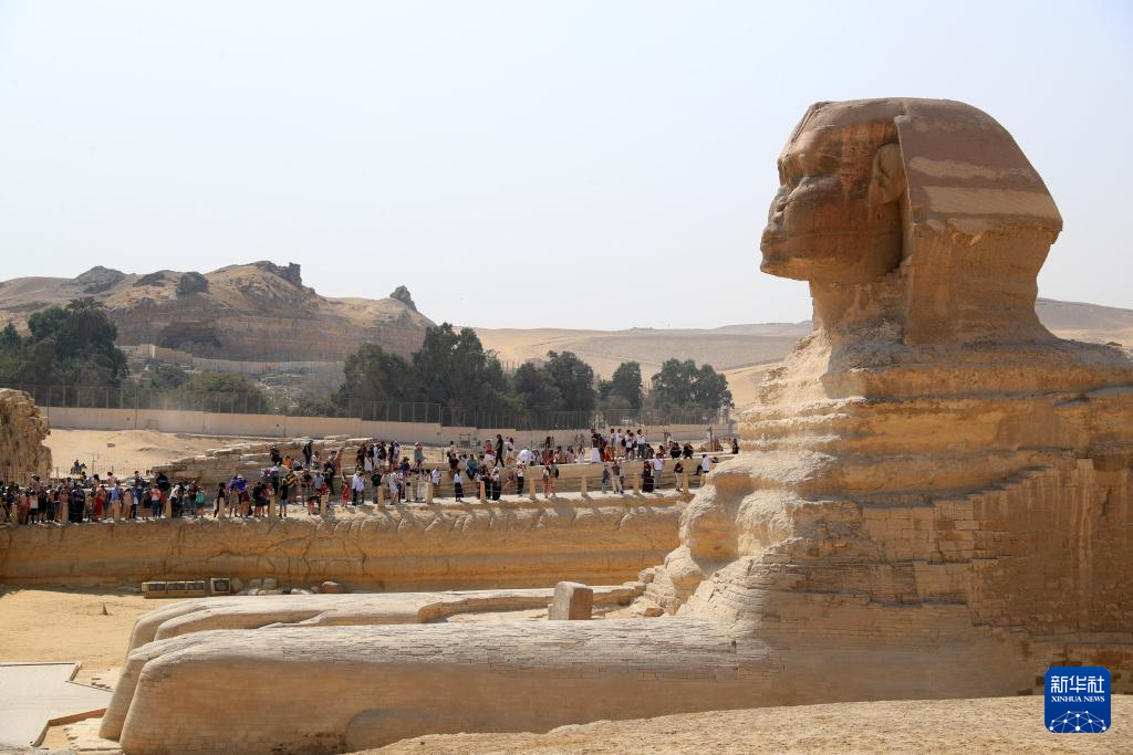 10月19日,游客在埃及吉萨金字塔景区参观狮身人面像。