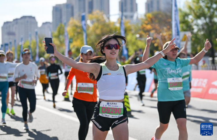 10月20日,半程马拉松参赛选手冲线后庆祝。