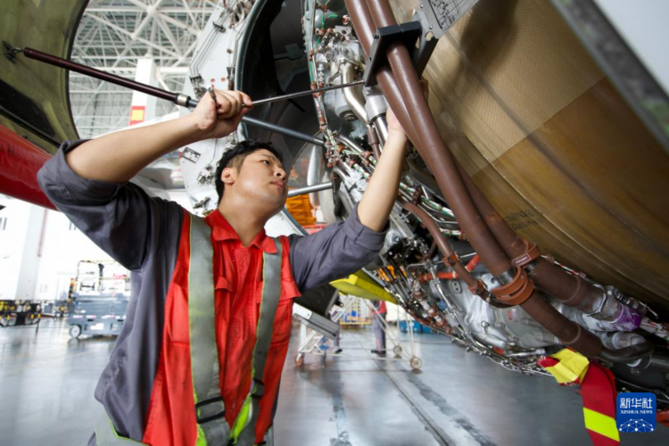 10月21日,在海南自贸港一站式飞机维修产业基地内,海航航空技术有限公司的机务维修人员更换进境飞机发动机部件。