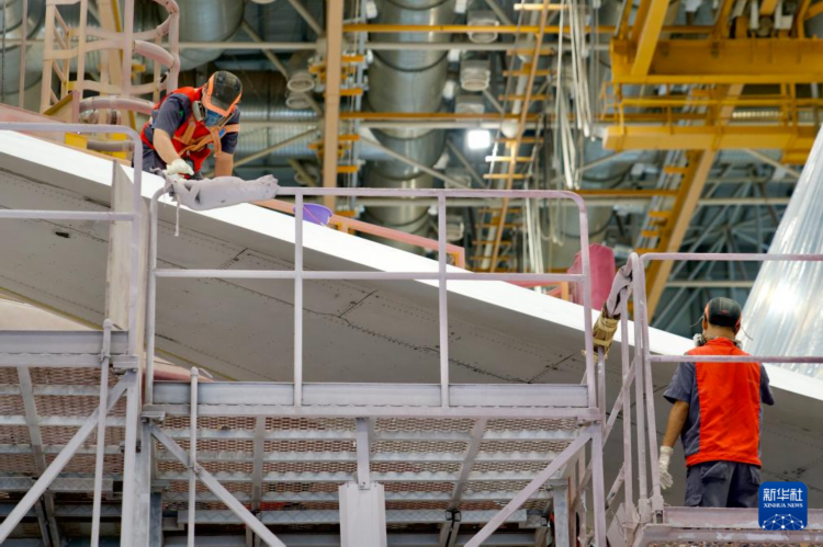 10月21日,在海南自贸港一站式飞机维修产业基地内,海航航空技术有限公司的机务维修人员对进境飞机进行喷涂前的清洁工作。