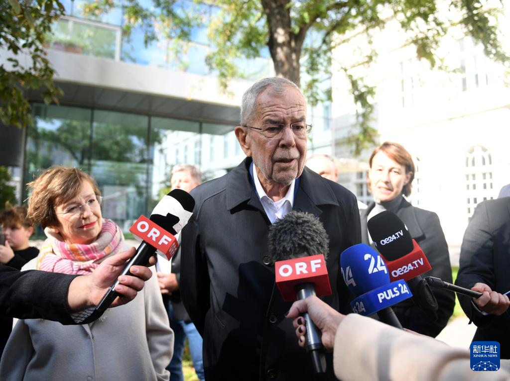这是9月29日,在维也纳的一处投票站,奥地利总统范德贝伦(中)在奥地利国民议会选举投票后接受媒体采访。