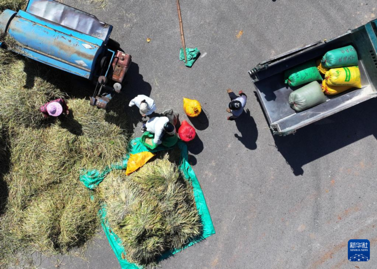 10月23日,村民在广西南宁市邕宁区蒲庙镇搬运收获的晚稻(无人机照片)。