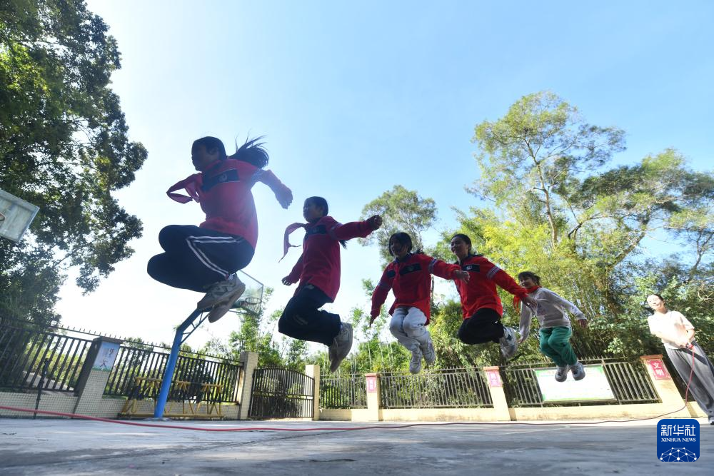在梧州市平浪希望小学,学生们在体育大课间跳竹竿舞(10月25日摄)。
