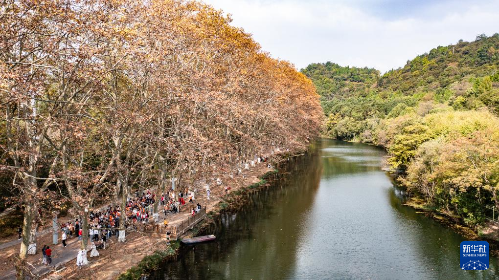 市民在贵阳市花溪国家城市湿地公园黄金大道观赏游玩(10月27日摄,无人机照片)。