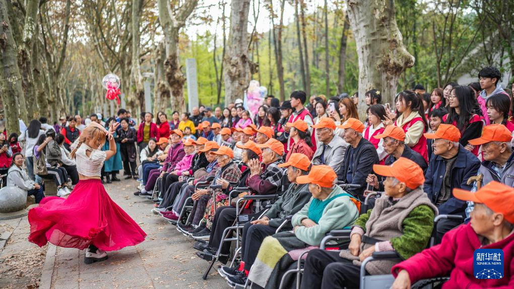 10月27日,志愿者在贵阳市花溪国家城市湿地公园给敬老院的老人表演舞蹈。