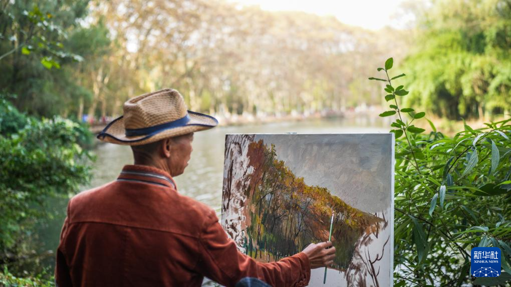 10月27日,市民在贵阳市花溪国家城市湿地公园黄金大道绘画。