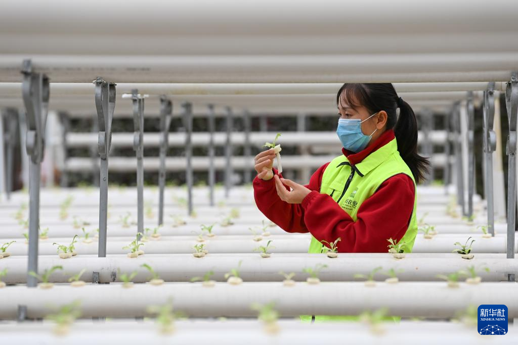 10月26日,杨凌现代农业创新园的工作人员查看通过管道式无土栽培技术种植的植物长势。