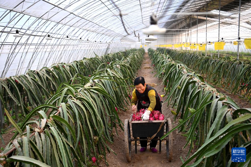 10月25日,一名果农在杨凌青皮她园火龙果基地的温室大棚采收火龙果。该基地安装了智能化控制设备和水肥一体化系统等,提升了“南果北种”的生产效率和经济效益。