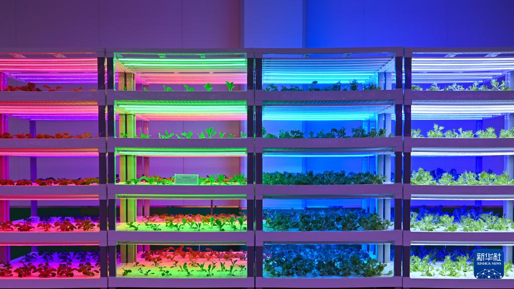 这是杨凌智慧农业示范园植物工厂内的水培植物单色光展示架(10月26日摄)。单色光技术能够在节省能耗的同时提高植物对光能的吸收利用效率。