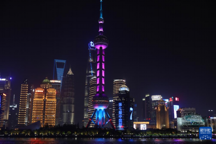 11月3日,位于上海陆家嘴的东方明珠广播电视塔和大楼亮起主题灯光,迎接第七届中国国际进口博览会开幕。