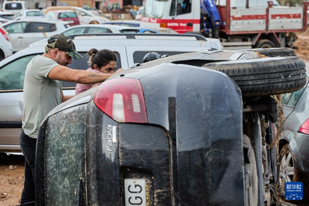 11月3日,西班牙巴伦西亚居民伊莎贝尔(右)在自己被洪水冲翻的车旁。 西班牙政府3日数据显示,该国东南部洪灾已致至少214人死亡。西班牙首相佩德罗·桑切斯2日宣布再向灾区派出5000名军人、5000名警察和国民警卫队人员,说这是“和平时期西班牙武装部队规模最大的一次行动”。此外,数千名志愿者投入救援,帮助灾区清理废墟、分发物资。 新华社记者 孟鼎博 摄