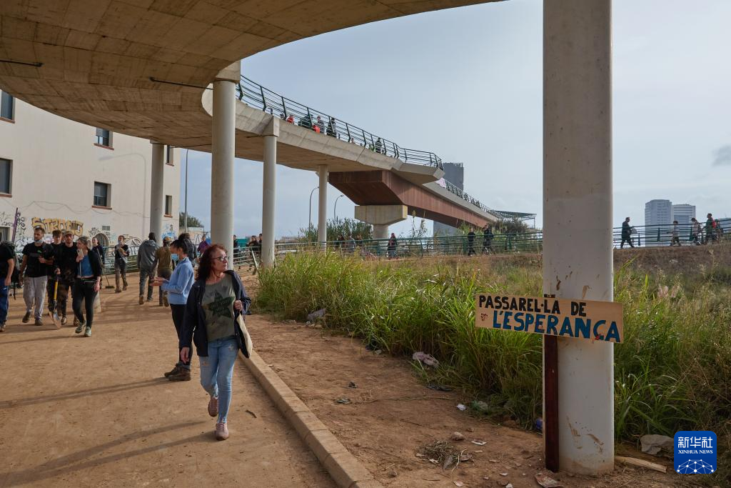 这是11月3日在西班牙巴伦西亚拍摄的“希望之路”,数以千计的志愿者通过这座人行桥进入受灾地区。