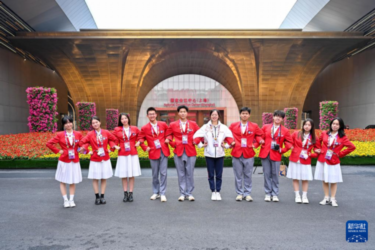 11月4日,志愿者在第七届中国国际进口博览会举办场地——国家会展中心(上海)留影。
