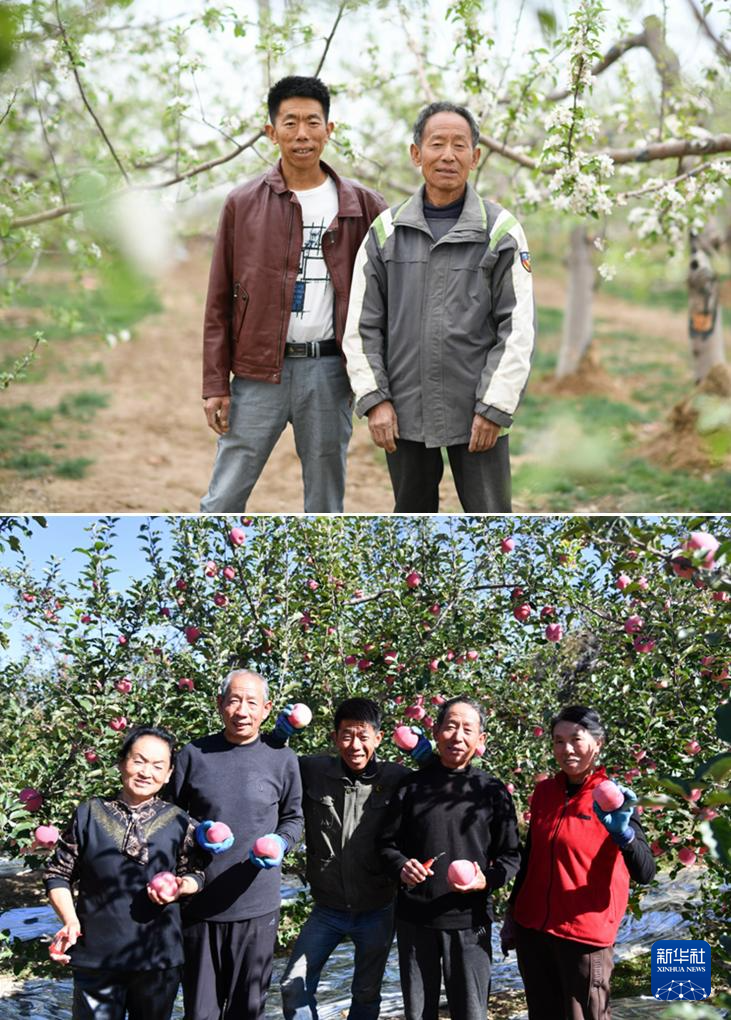拼版照片:上图为4月15日,延安市安塞区南沟村,赵永东(右)与儿子赵伟在果园合影;下图为10月10日,赵永东(右二)与家人在果园合影。