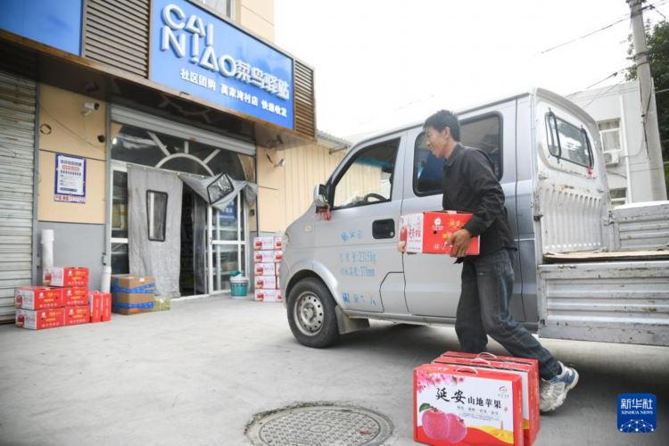 10月29日,延安市安塞区南沟村,赵伟将出售的苹果送至快递站点发货。