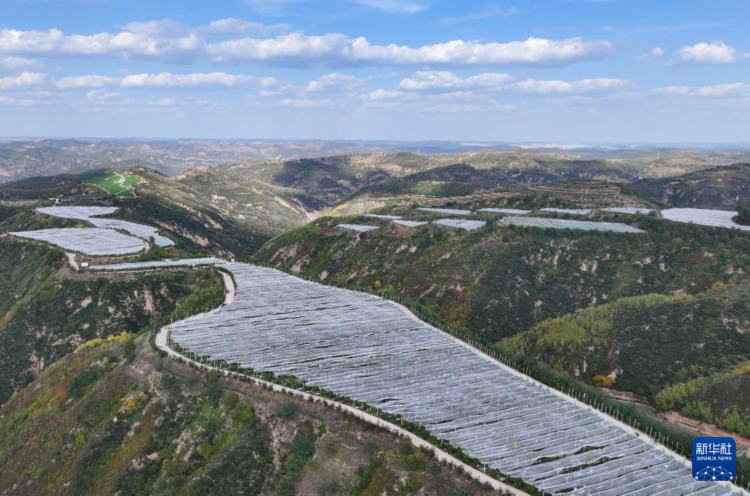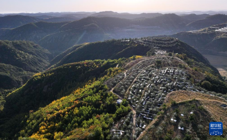 深秋时节,黄土高原色彩斑斓。陕西省延安市安塞区高桥镇南沟村,从空中俯瞰,一片片山地苹果园镶嵌在山峁之间,硕果累累。