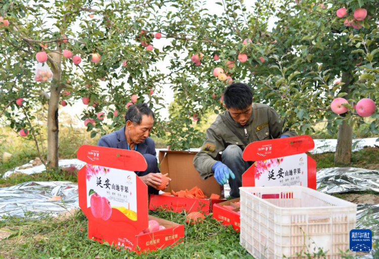 10月9日,延安市安塞区南沟村,赵永东(左)与儿子赵伟在果园将顾客订购的苹果装箱。