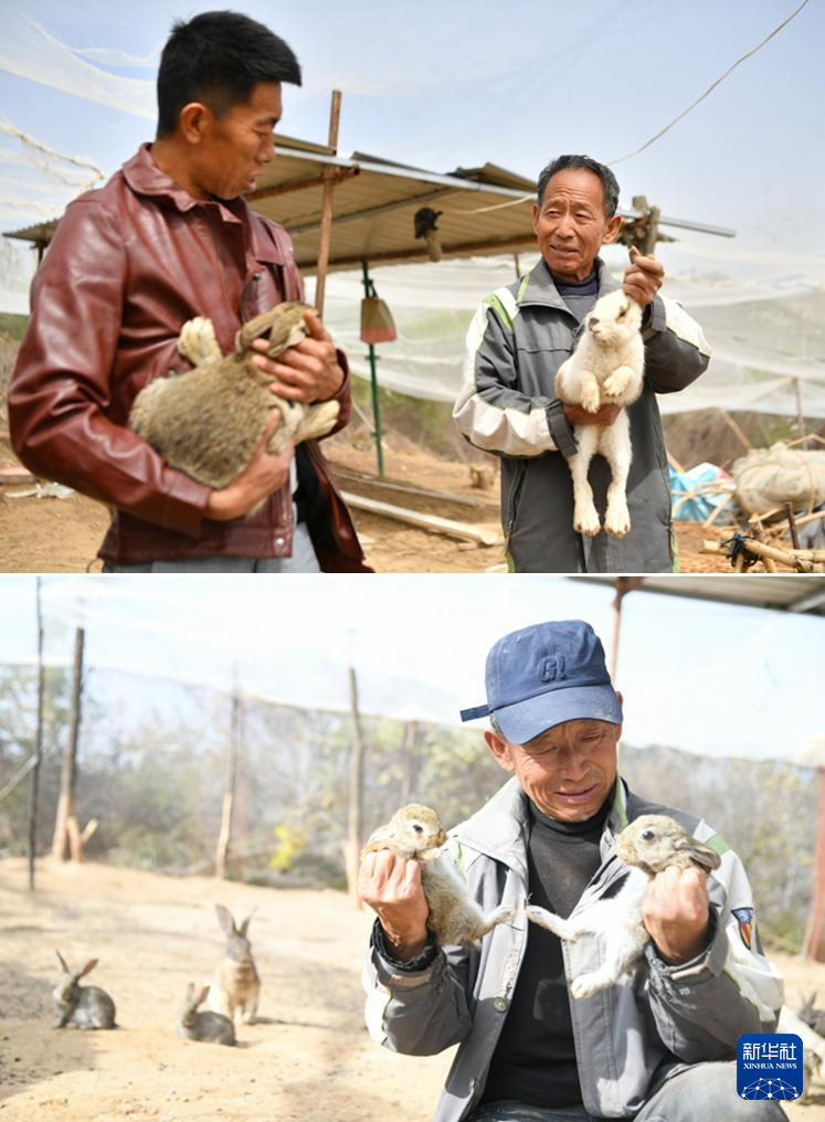 拼版照片:上图为4月15日,延安市安塞区南沟村,赵永东(右)与儿子赵伟在圈舍查看种兔生长情况;下图为10月29日,赵永东在圈舍查看种兔幼崽生长情况。