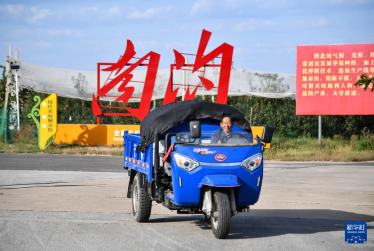 10月9日,延安市安塞区南沟村,赵永东驾驶农用三轮车行驶在果园旁。