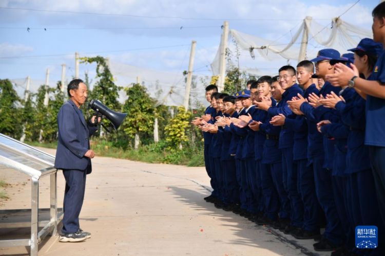 10月9日,延安市安塞区南沟村,赵永东(左一)在村集体果园为前来研学的学生讲解。