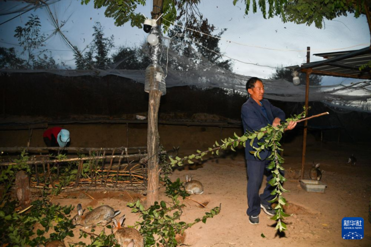 10月9日,延安市安塞区南沟村,赵永东与妻子王顺利喂养种兔。2023年底,赵永东开始探索循环种养模式,以苹果枝叶作为种兔饲料,将种兔粪便用作果树肥料。目前,赵永东养殖的种兔数量已由60只增长至300余只。