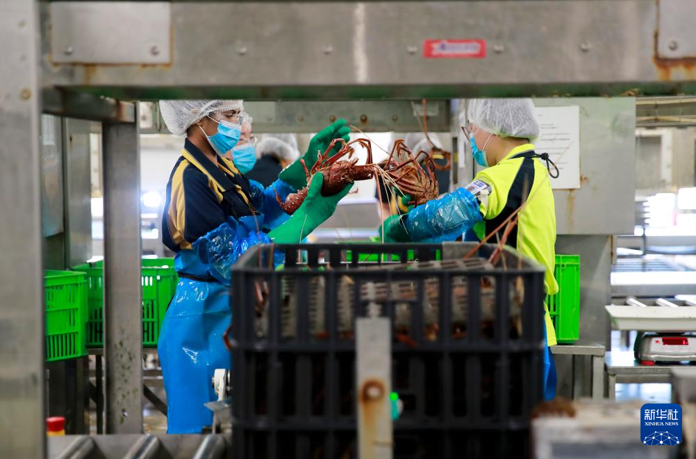 10月24日,在澳大利亚珀斯的吉龙腾设备车间内,员工为岩龙虾称重、分类。