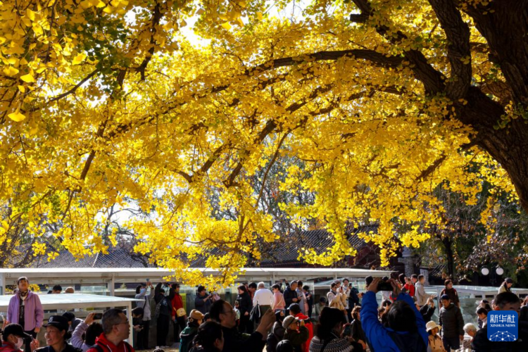 晚秋时节,北京五塔寺院内银杏尽黄,吸引许多市民、游客赏秋游园。