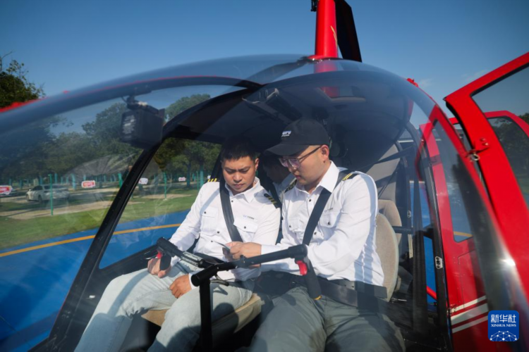 11月5日,在湖州米旗通航直升机飞行基地,飞行教员(右)带领学员进行日常培训。