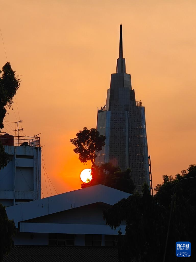 这是7月12日在印度尼西亚雅加达拍摄的罗盘多媒体大楼和落日(手机照片)。 雅加达位于印度尼西亚爪哇岛西北海岸,是印度尼西亚的最大城市,也是全国的政治、经济、文化中心。 新华社记者 徐钦 摄