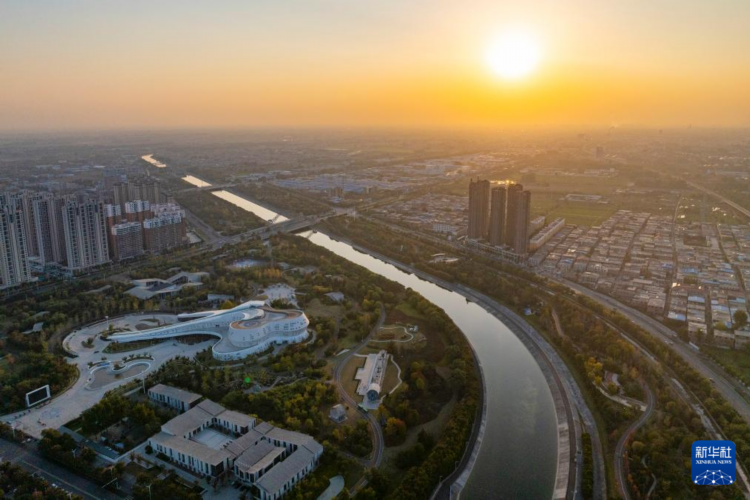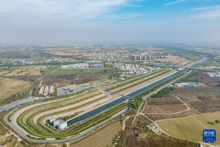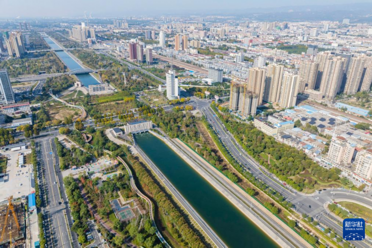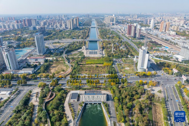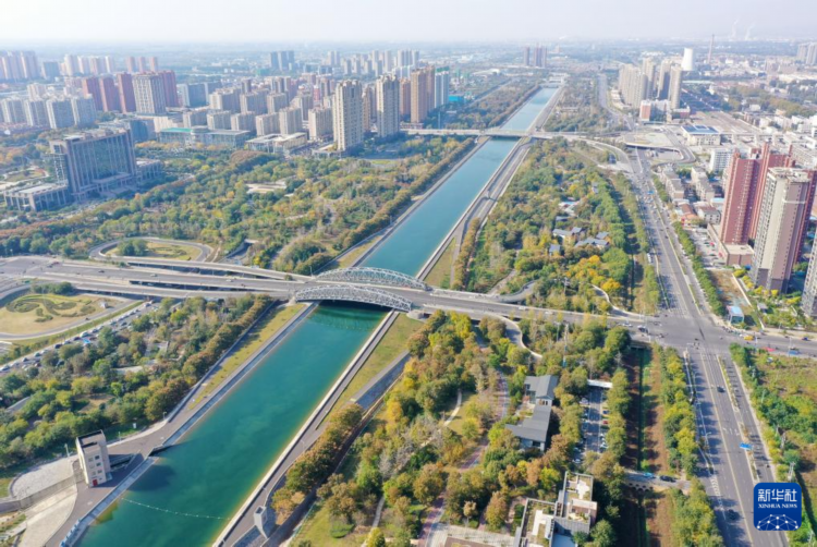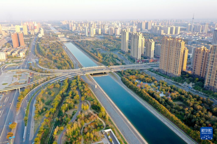 河南省焦作市区南水北调干渠及两岸风景(11月5日摄,无人机照片)。