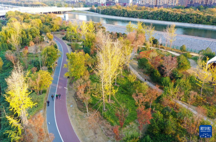 河南省焦作市是南水北调中线工程唯一穿城而过的城市,穿城河道两侧建成了10公里长的绿色廊道,被称为天河公园,这是市民在天河公园游玩(11月5日摄,无人机照片)。