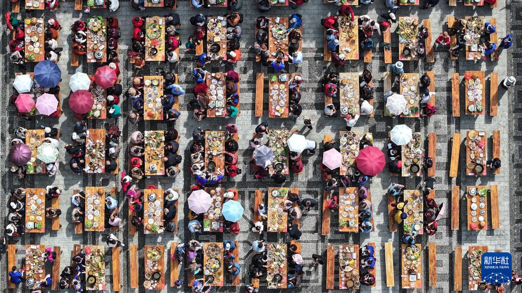 11月9日,广西三江侗族自治县的侗族群众举办油茶宴欢迎前来参加多耶节活动的客人(无人机照片)。