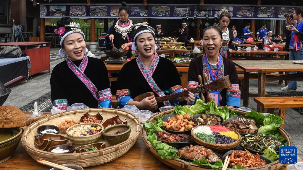11月9日,在广西三江侗族自治县月也侗寨油茶宴上,侗族妇女在弹唱歌曲。