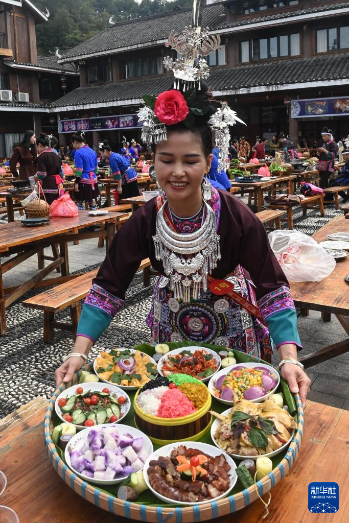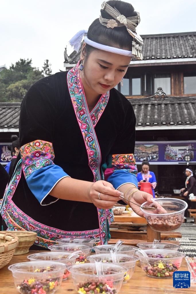11月9日,在广西三江侗族自治县月也侗寨,一名侗族妇女在摆放油茶宴食品。