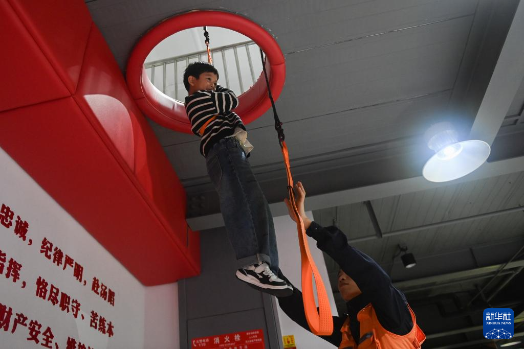 11月9日,小朋友在“笑笑橙”青少年消防应急安全体验馆体验“消防员”高空速降。