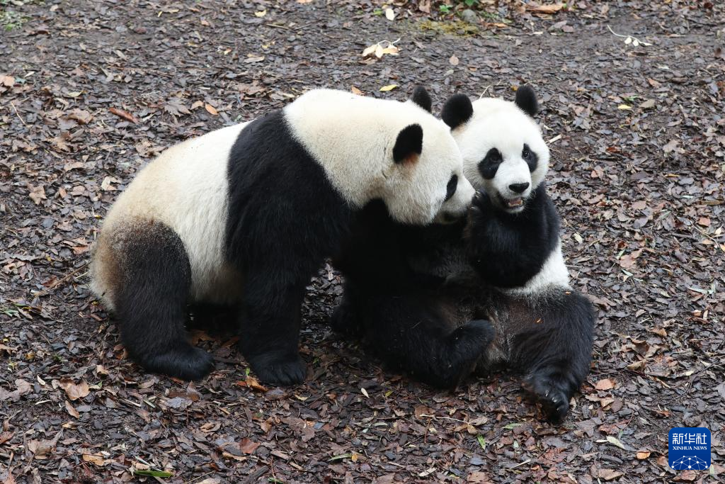 11月10日,在位于比利时布吕热莱特的天堂动物园,大熊猫“宝弟”(左)和“宝妹”在嬉戏。