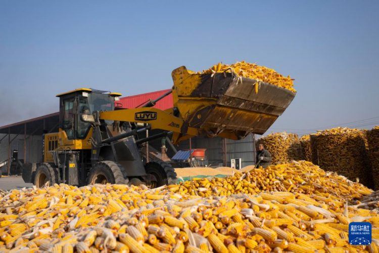 11月13日,在黑龙江省肇东市一处秋粮晾晒场,海城双丽现代农机专业合作社的农民驾驶农机堆放玉米。