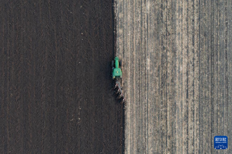 11月12日,在黑龙江省肇东市海城镇,农民驾驶农机进行整地作业(无人机照片)。