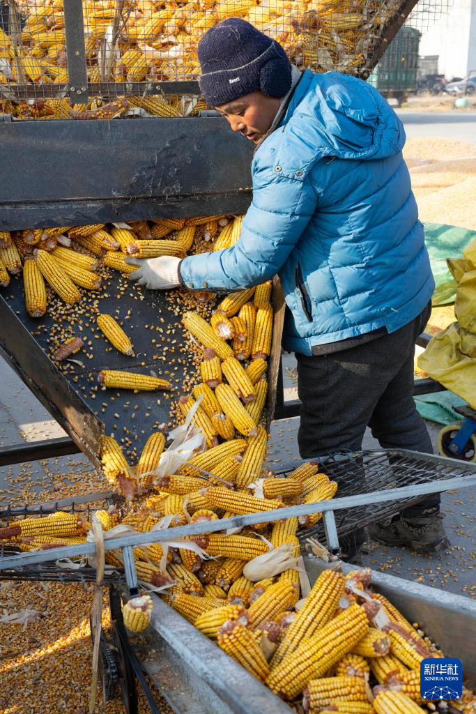 11月13日,在黑龙江省肇东市一处秋粮晾晒场,海城双丽现代农机专业合作社的农民在堆放玉米。