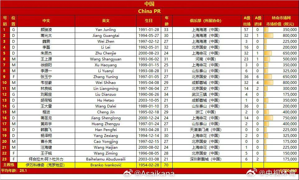 目前中国队本场比赛23人大名单