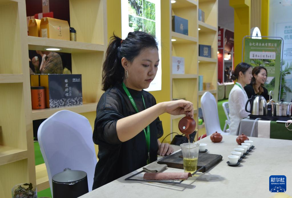 11月16日,在第十六届海峡两岸茶博会现场,茶艺师在冲泡茶叶。