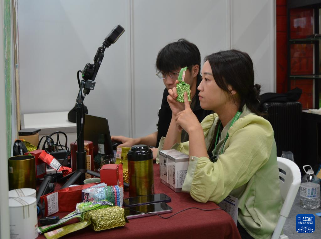 11月16日,在第十六届海峡两岸茶博会现场,参展商直播卖货。