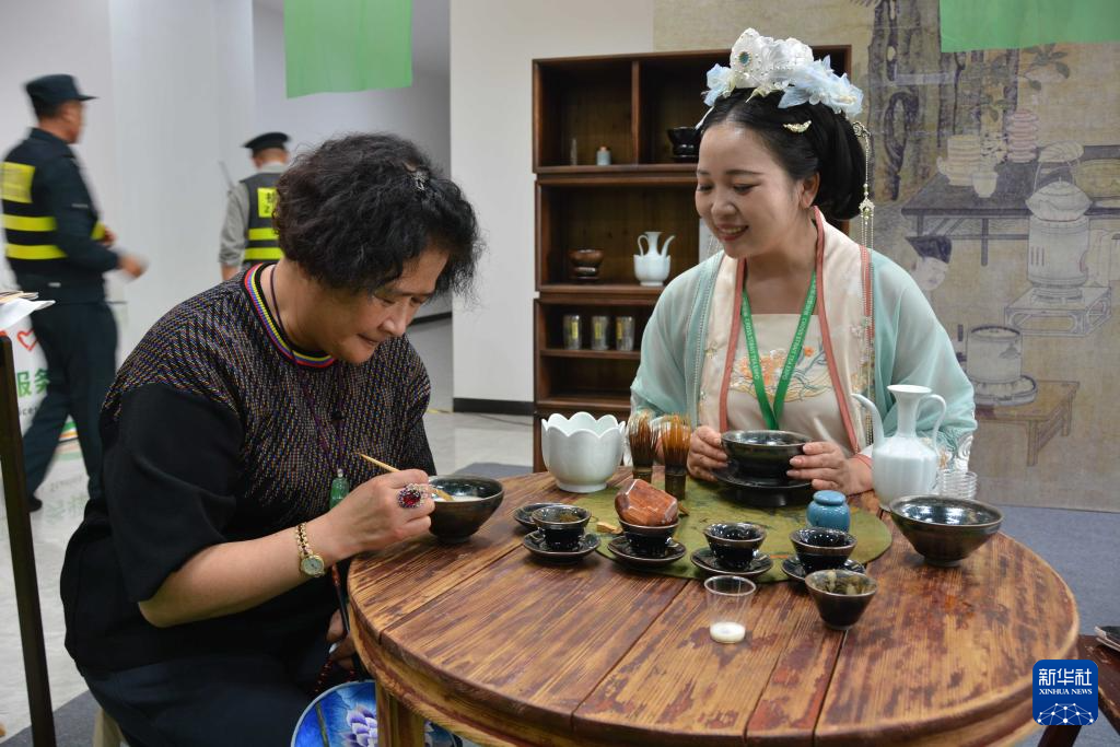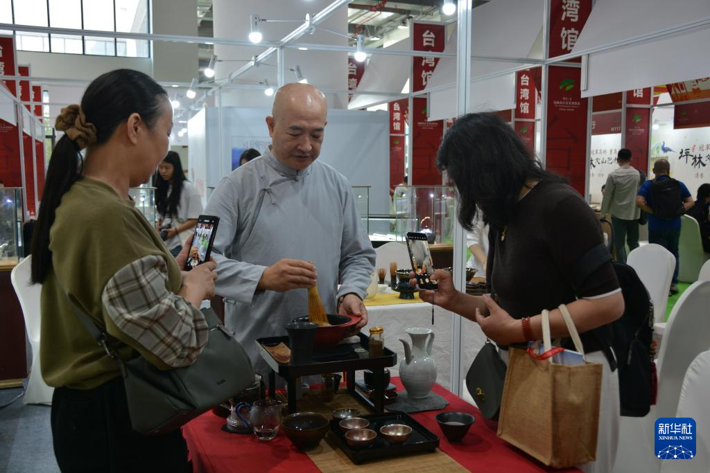 11月16日,在第十六届海峡两岸茶博会现场,一位观众体验宋式点茶技艺。