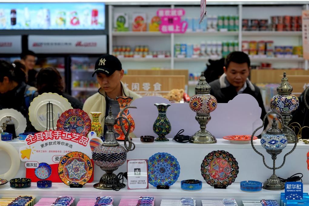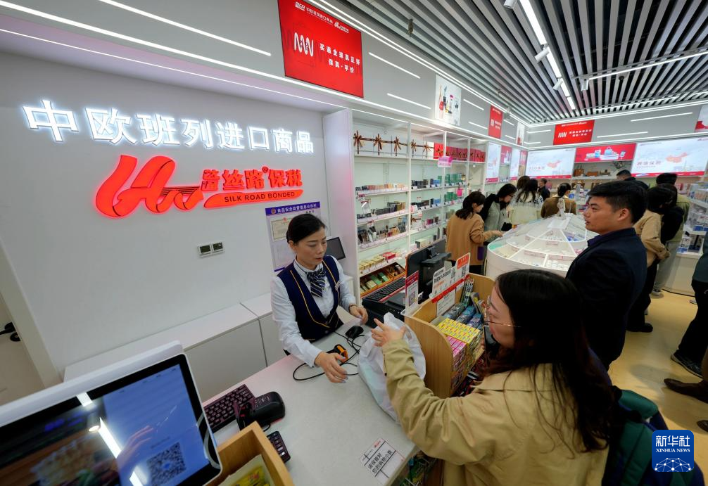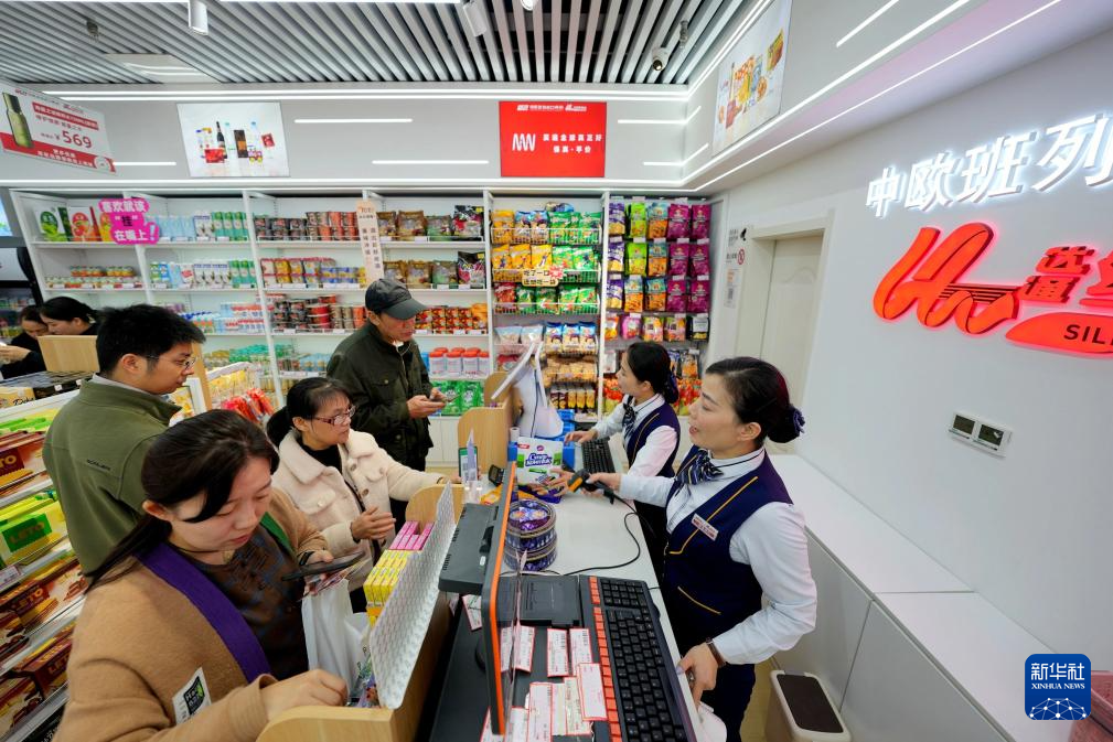 11月17日,旅客在湖北汉口车站中欧班列进口商品保税店选购商品。