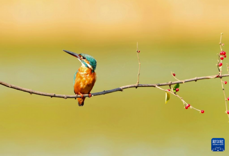 翠鸟在济南森林公园揽翠湖畔枝头观望(11月17日摄)。