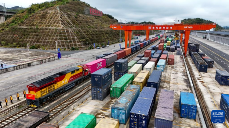 11月19日,一列搭载动力锂电池的列车停靠在贵阳国际陆港都拉营站(无人机照片)。