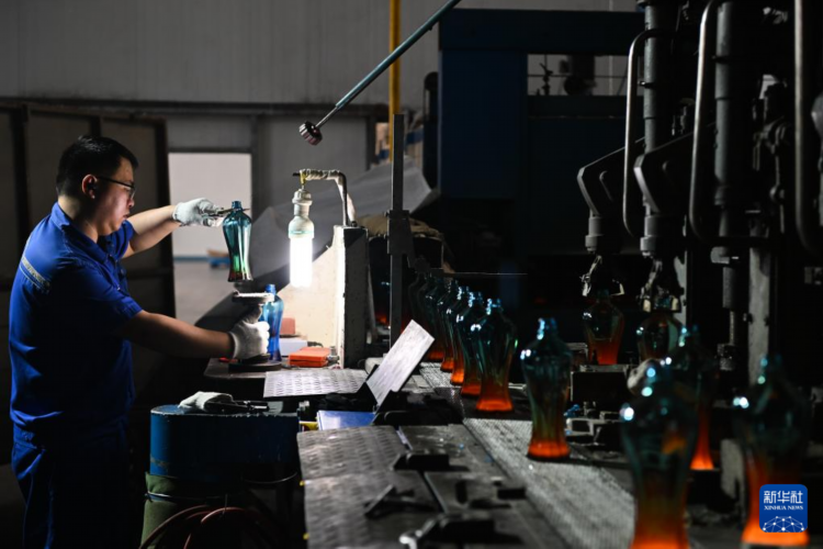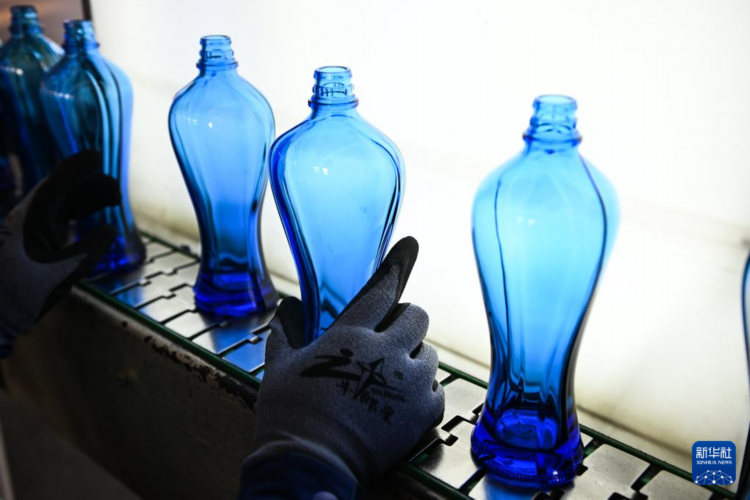 11月21日,工人在江苏蓝色玻璃集团车间生产酒瓶。