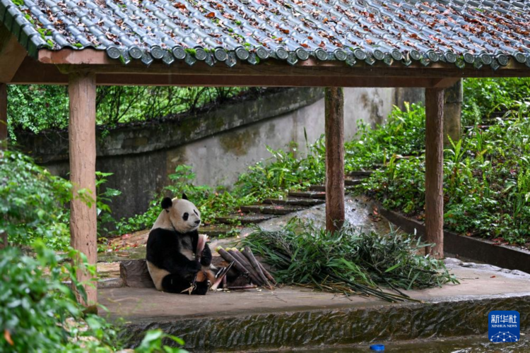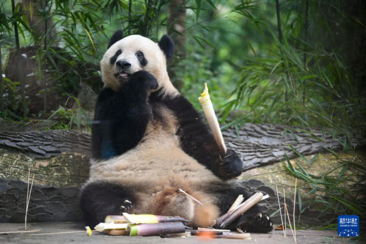 6月26日,在中国大熊猫保护研究中心雅安碧峰峡基地,大熊猫“美生”在吃竹笋。大熊猫“美生”,雄性,2003年8月19日出生于美国圣迭戈动物园。