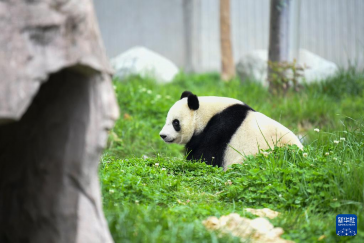 4月16日,在中国大熊猫保护研究中心卧龙神树坪基地,大熊猫“升谊”在外场休息。大熊猫“升谊”,雌性,2021年5月31日出生于马来西亚国家动物园。
